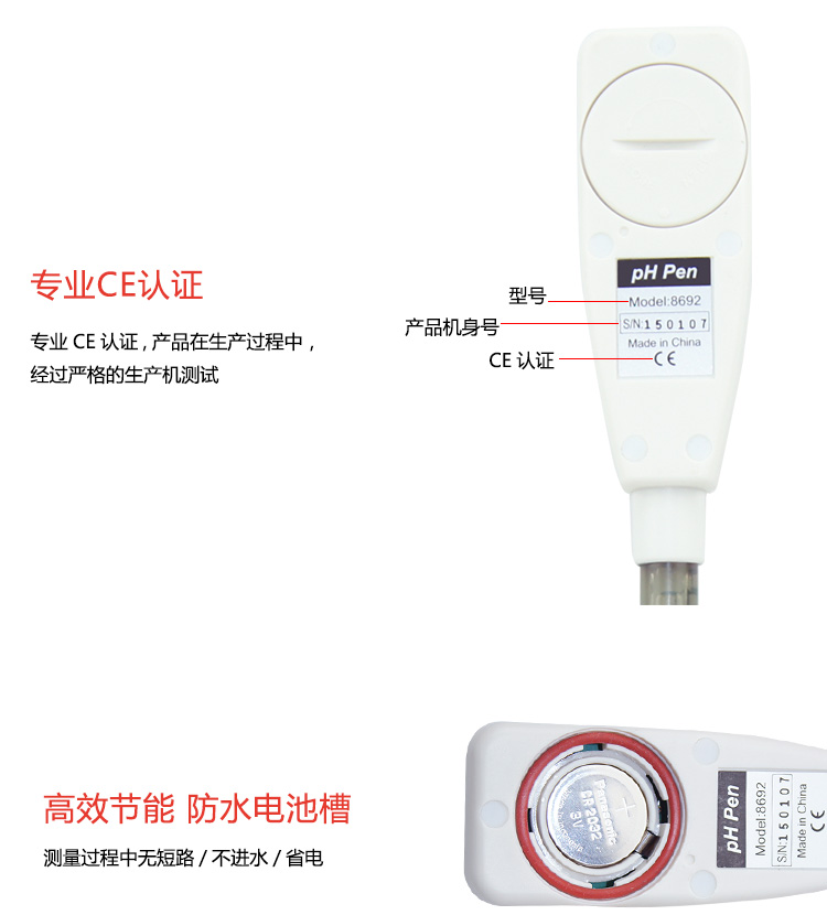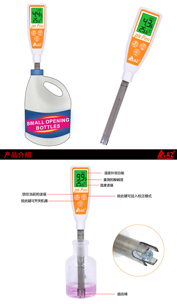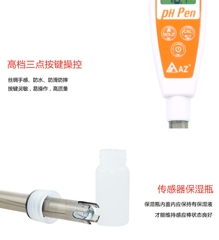 經(jīng)濟(jì)筆型酸堿計(jì),雙屏幕可同時(shí)顯示溫度與酸堿值(8681/8682);溫度補(bǔ)償功能,三點(diǎn)自動(dòng)校正,簡(jiǎn)易操作。具有IP67級(jí)數(shù)防水功能;自動(dòng)補(bǔ)償/辯識(shí)溶液溫度避免校正錯(cuò)誤;資料保留功能,省電關(guān)機(jī)可解除。